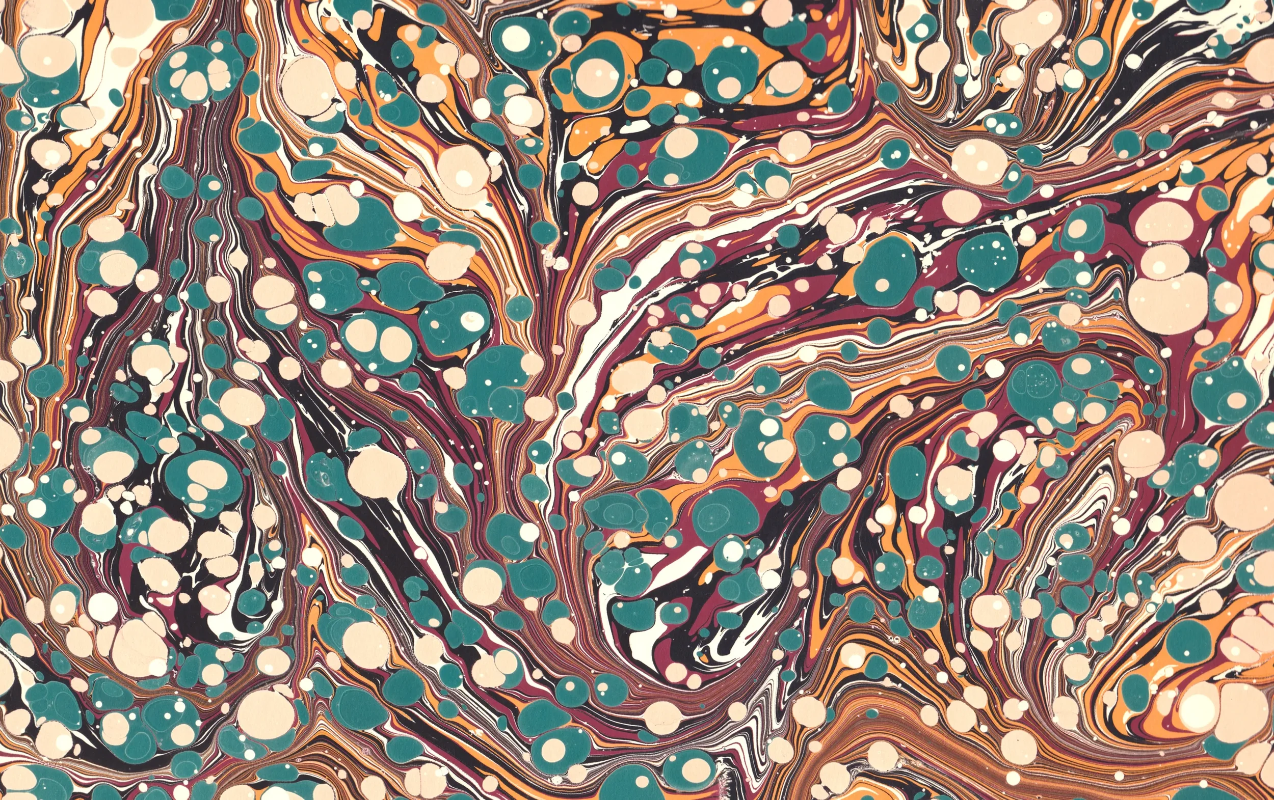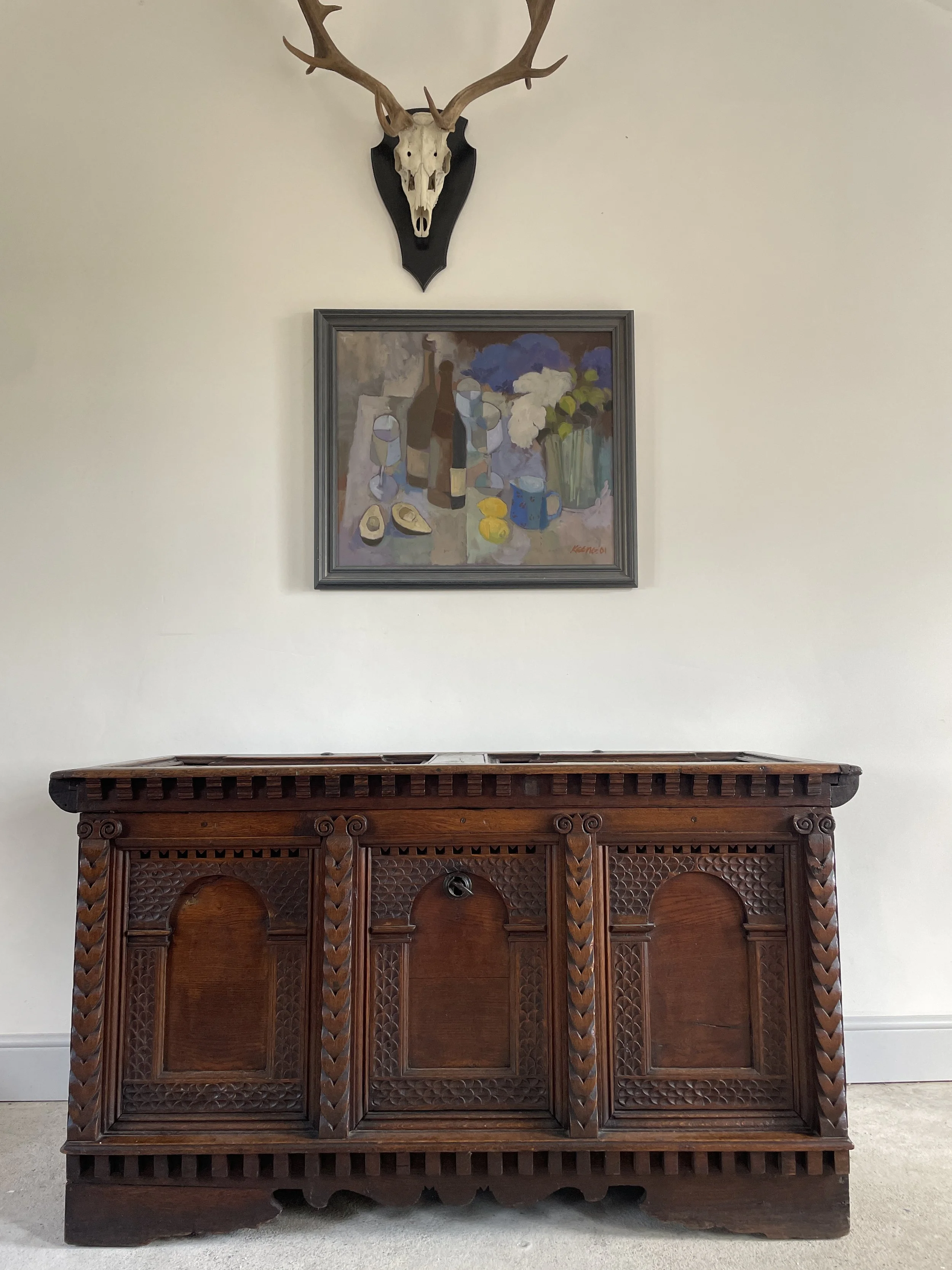 A table lamp with a beige fabric lampshade and ornate metallic base on a dark wooden surface.