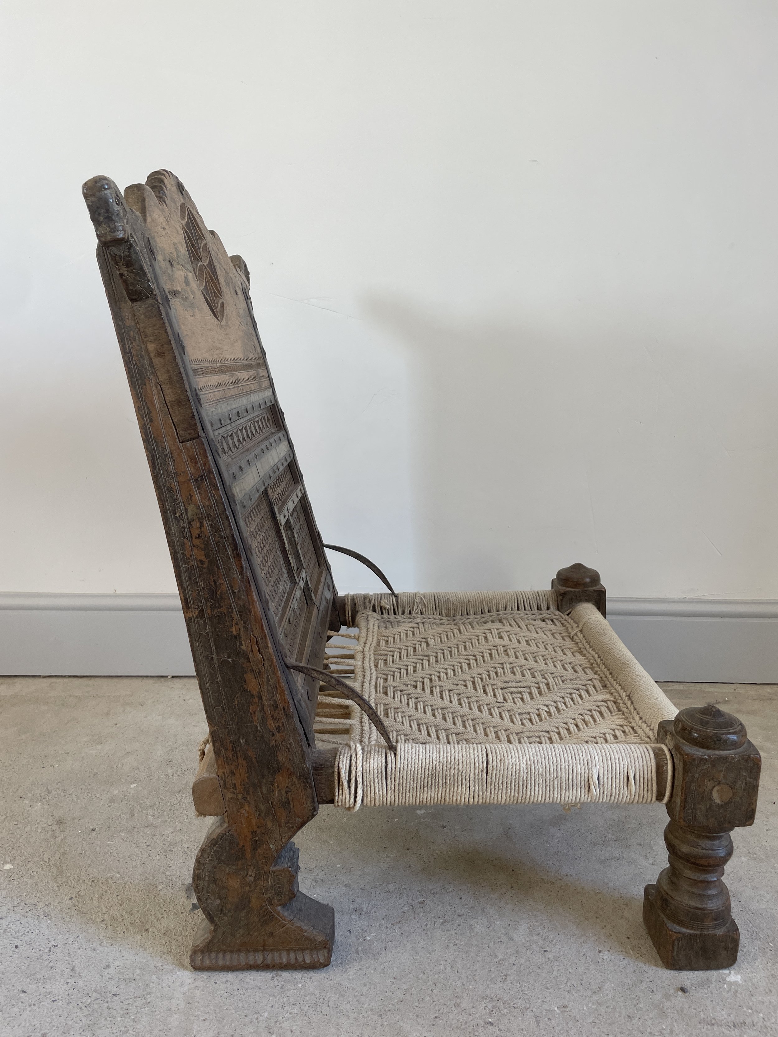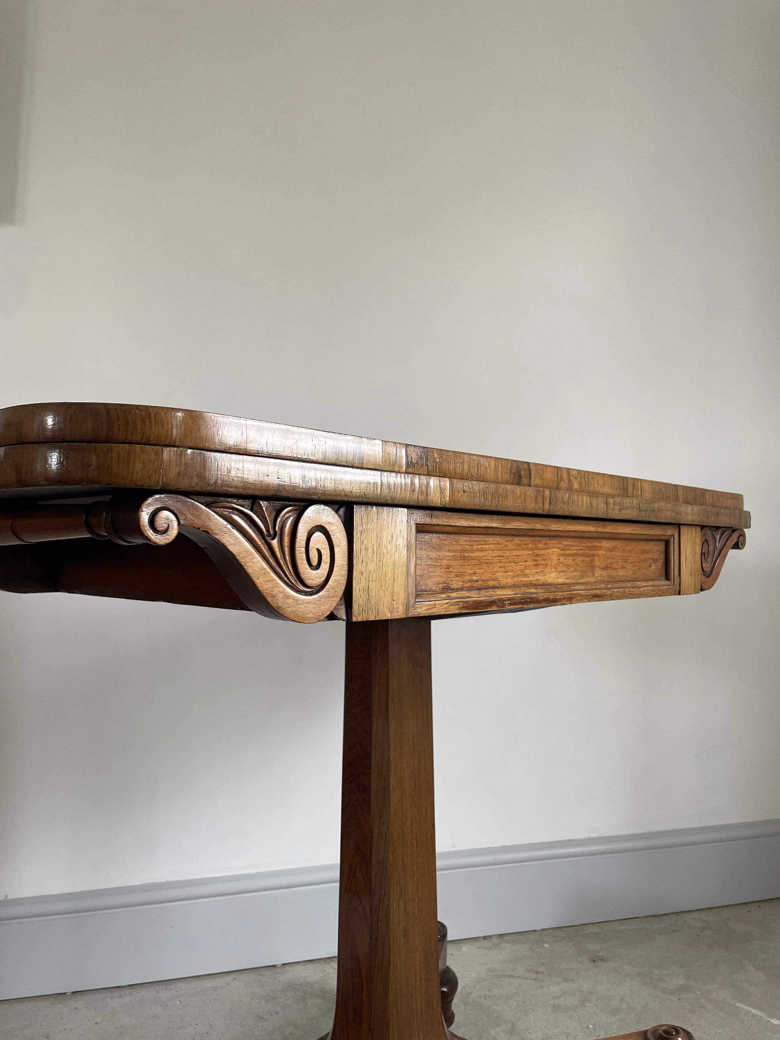 A round wooden table with a tilt, standing on a single turned pedestal with three curved legs on a carpeted floor against a white wall.