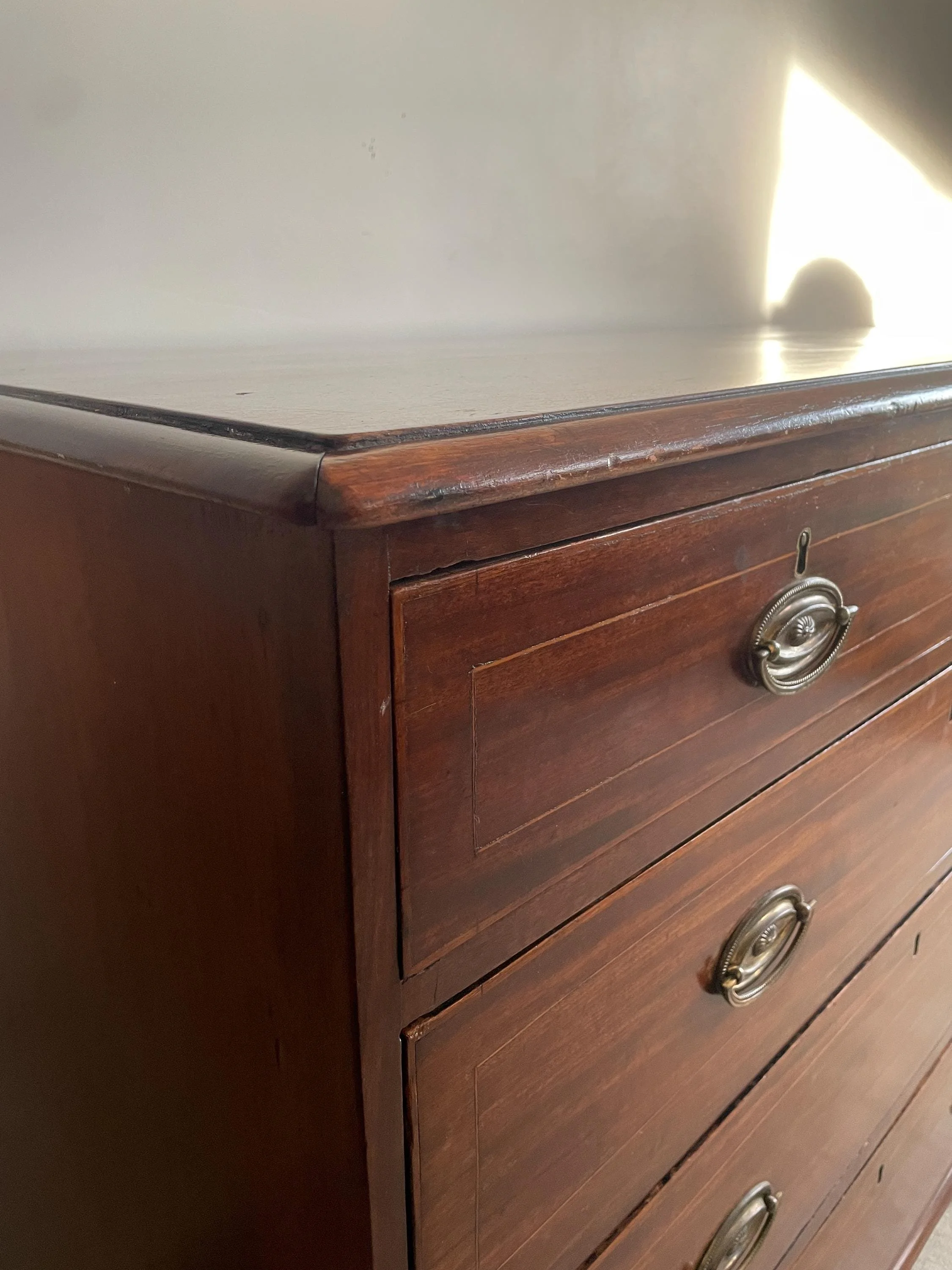 A lovely 19th century mahogany antique set of drawers, with satinwood banded inlay formed of two short over three long drawers with oval brass back plate handles. On bracket feet A wonderful classically designed piece which would sit very well in a living room or bedroom