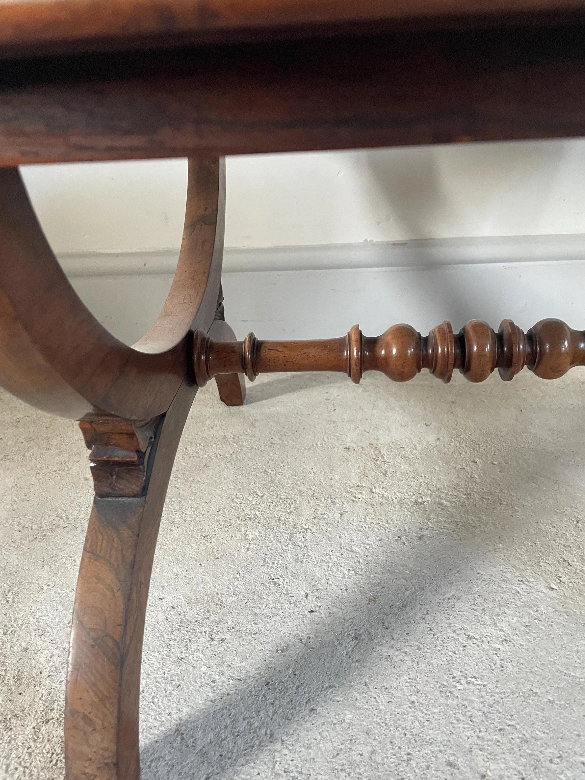 A carved walnut foot stool with crossed stretcher and tribal upholstery, a very elegant piece, probably early to mid 19th century, recently re-upholstered.